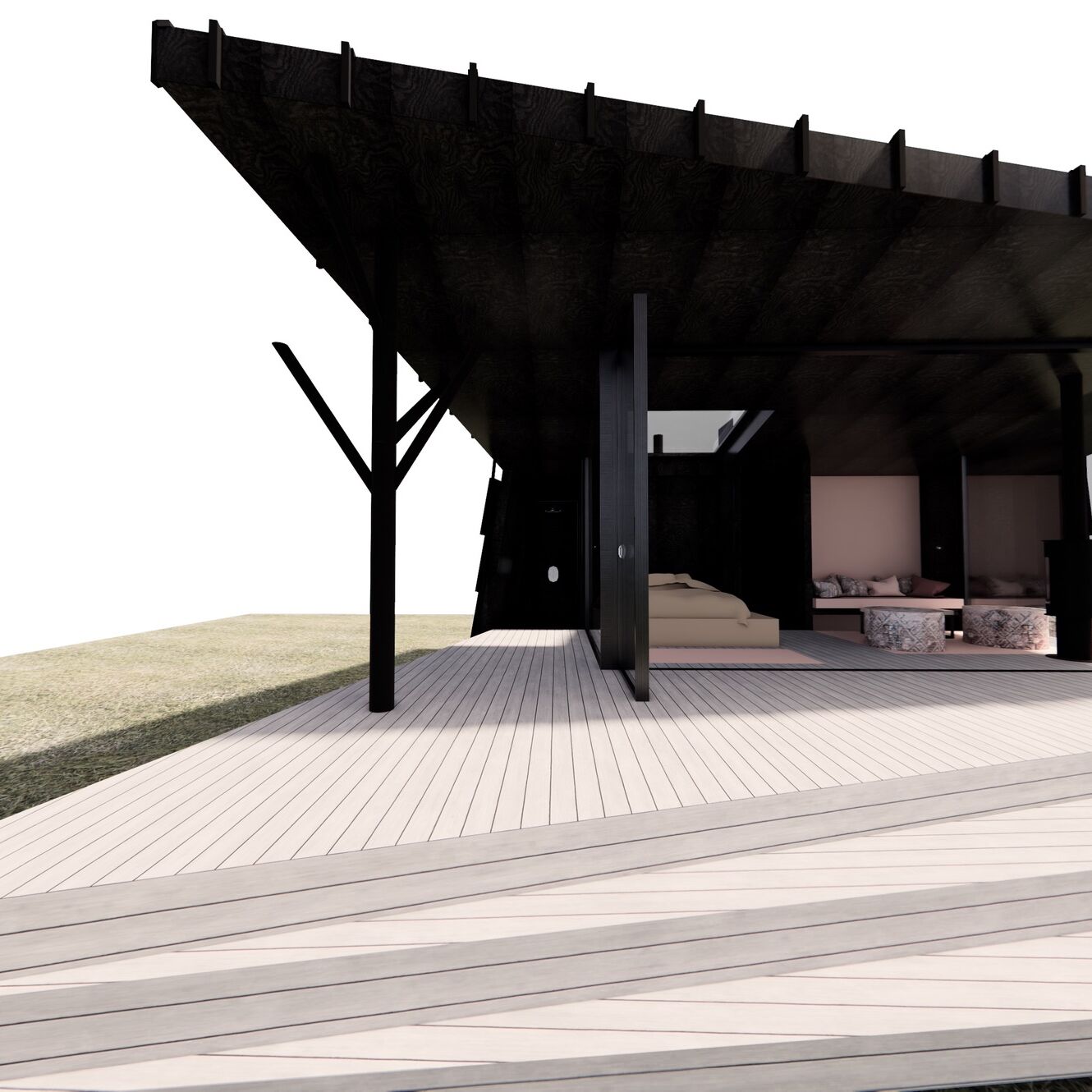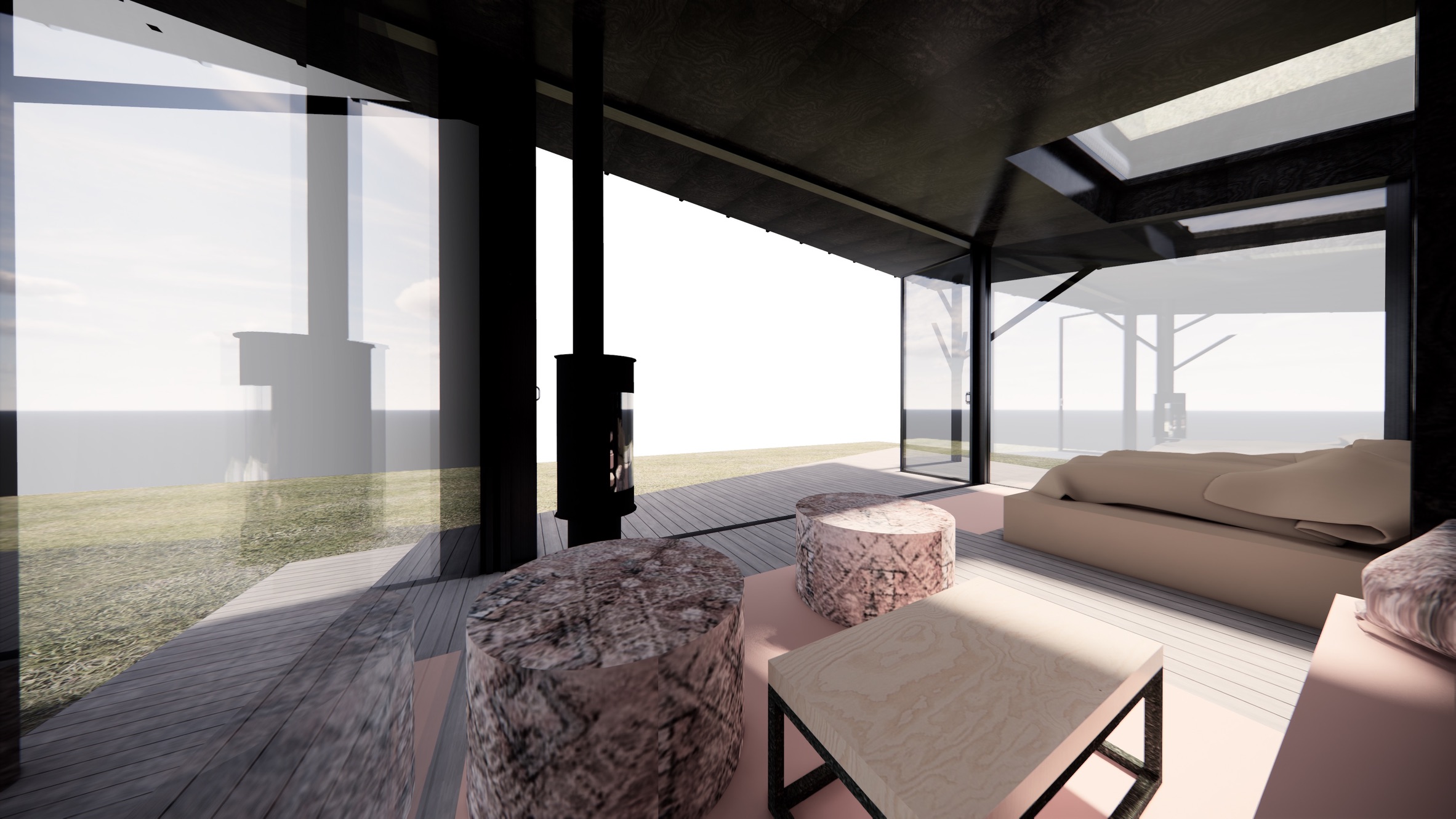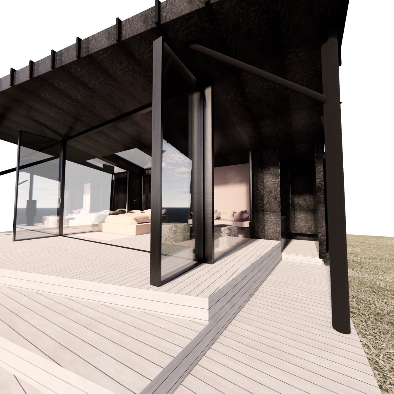 Her viskes grensene mellom inne og ute bort med 180 graders utsyn og en trekkspilldør som åpner hele fronten og gjør rommet til en del av naturen.