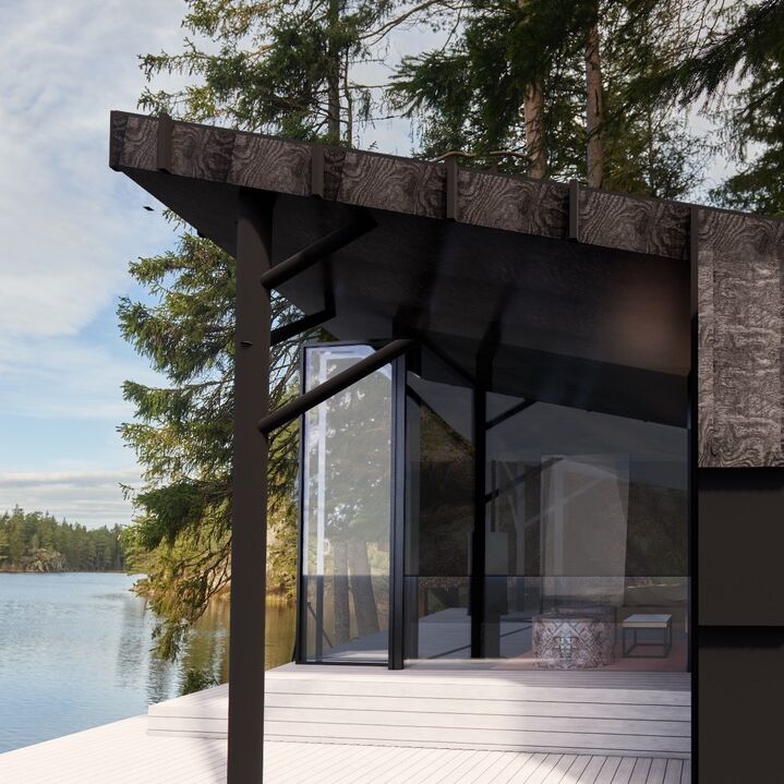 En hel vegg kan åpnes, slik at inne og ute smelter sammen. Her får du et lunt tilfluktssted, samtidig som du er tett på naturen med utsikt i flere retninger. Fargene i omgivelsene har fått sette tonen, og bygget er holdt i rolige nyanser som gir en harmonisk base. På liten plass har vi skapt rom for den store opplevelsen.“